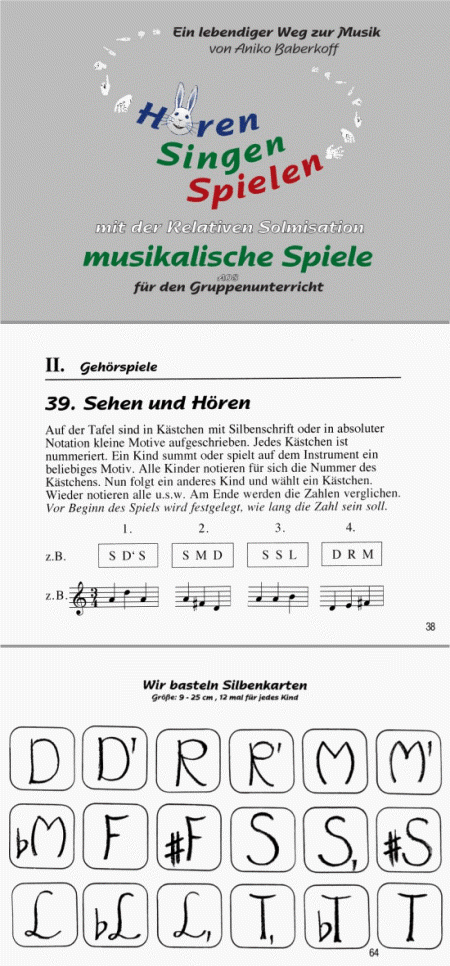 „Musikalische Spiele für den Gruppenunterricht“ zeigt eine Reihe von musikalischen Spielen, die im Spielkreisunterricht über mehrere Jahrzehnte entstanden und ausprobiert wurden. Grundlage des Gruppenunterrichts ist, die relative Solmisation. Die Singsilben sind ein wichtiges Element des Unterrichts. Ton- und Rhythmuskärtchen, aber auch Hilfsmittel zum Schreiben helfen, die visuelle Darstellung von Musikalischen Elementen zu verinnerlichen. Gespielt wird mit einfachen Perkussionsinstrumenten oder dem eigenen Instrument. Nach der Reihenfolge „Hören Singen Spielen“ stehen die „Gehörspiele“ im Vordergrund. Danach werden Töne zunächst gesungen und Rhythmen einfach geklopft oder getanzt. Das Heft „Musikalische Spiele für den Gruppenunterricht“ hält für jede Art von musikalischen Gruppenunterricht Anregungen bereit.